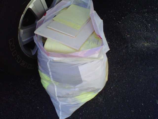 I cleaned out my car today. 8 years of company crap built up inside my car. Old log books, training material, employee handbook, more rule books, sweatshirts, t-shirts, baseball caps all my the company name on them. All went into a trash bag today. Actually I tried to stuff it all into one trash bag, but didn't succeed, so two trash bags it was. I just accumulated so much stuff.